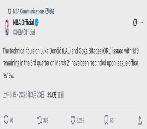 北京时间3月23日,NBA官方宣布:经过联盟办公室审查,撤销湖人球员东契奇和魔术球员比塔泽的技术犯规。东契奇本赛季的技犯总数维持15次,下一场打活塞不会被禁赛。昨天湖人vs魔术,东契奇和比塔泽互喷垃圾话,当时各吃了一T。
