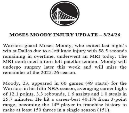 爆料王Shams:穆迪遭遇左膝髌腱撕裂,提前结束本赛季的征程......名记Siegel对此补充道:预计穆迪还将缺席26-27赛季大部分比赛。
