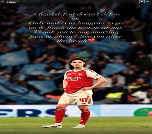 在英联杯决赛0-2输给曼城后,阿森纳中场赖斯今日更新社交媒体鼓励球队。