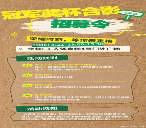 关注‘中赫工体’并转发即可参与【冠军奖杯合影资格】抽签,中签球迷3月21日持中签凭证可至球迷嘉年华现场进行拍摄留念。